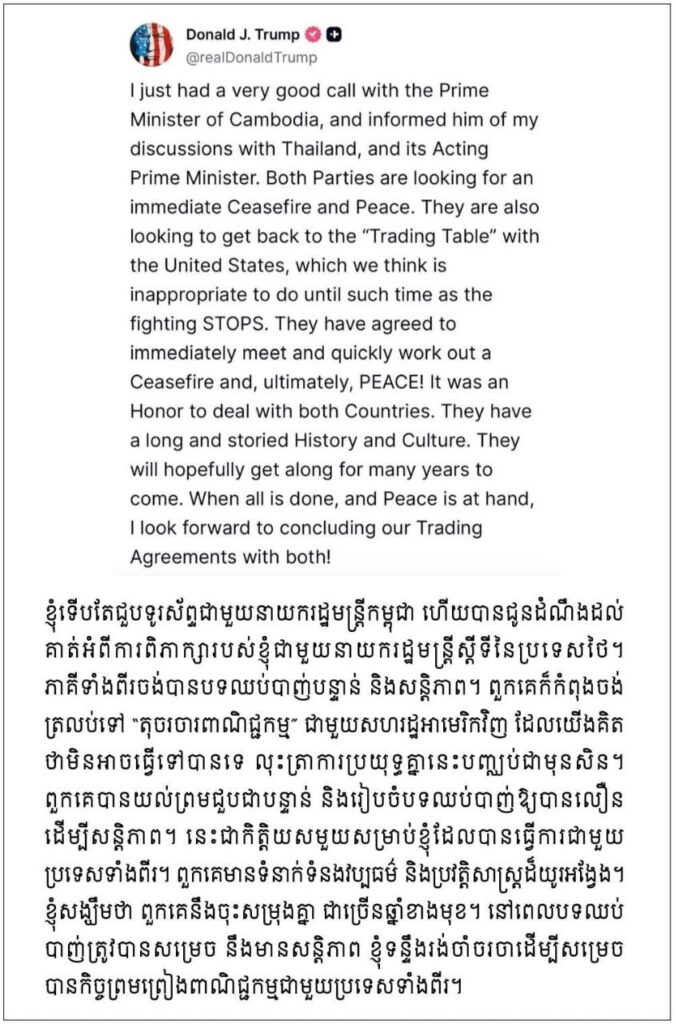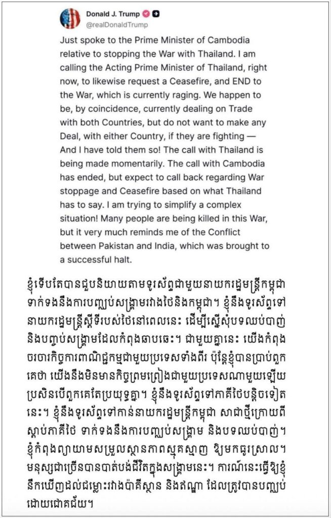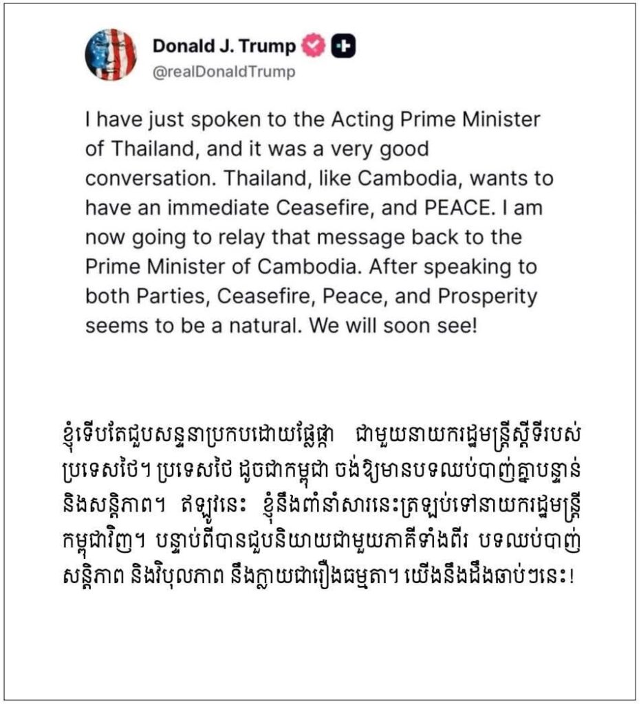 ពាក់ព័ន្ធនឹងការប្រយុទ្ធគ្នារវាង កងទ័ពកម្ពុជា និងកងទ័ពថៃ ឯកឧត្តម ប្រធានាធិបតី Donald Trump ក៏ចង់ឃើញនូវការឈប់