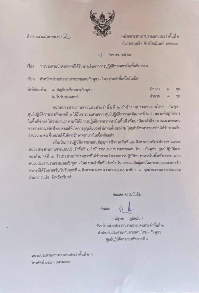 ខែសីហា ឆ្នាំ២០២៥ ដែលមានរថយន្តសង្គ្រោះរបស់ខ្មែរយើងចំនួនបីគ្រឿងទៅចាំទទួលនៅព្រំដែន អូរស្មាច់។ កាលថ្ងៃទី