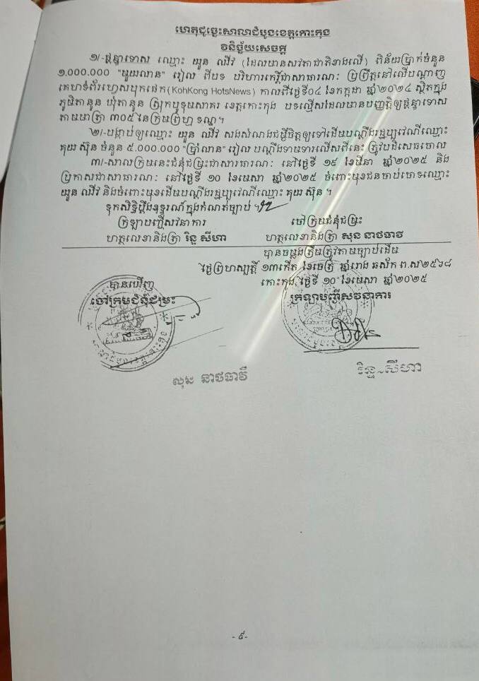 រដ្ឋប្បវេណីចំនួនតែ៥លានរៀលប៉ុណ្ណោះ និងពិន័យ១លានរៀលចូលរដ្ឋ។ នេះយោងតាម សាលក្រមលេខ ២៩ «ខ» ចុះថ្ងៃ