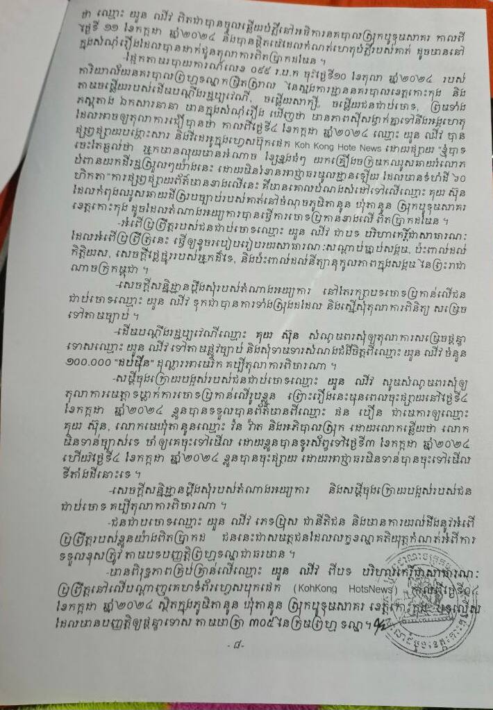 កោះកុងៈ បន្ទាប់ពីការចុះផ្សាយរបស់កាសែត « កោះកុងហតញូស៍ » កាលពីថ្ងៃទី៤ ខែកក្កដា ឆ្នាំ២០២៤ បរិយាយរៀបរាប់ថា