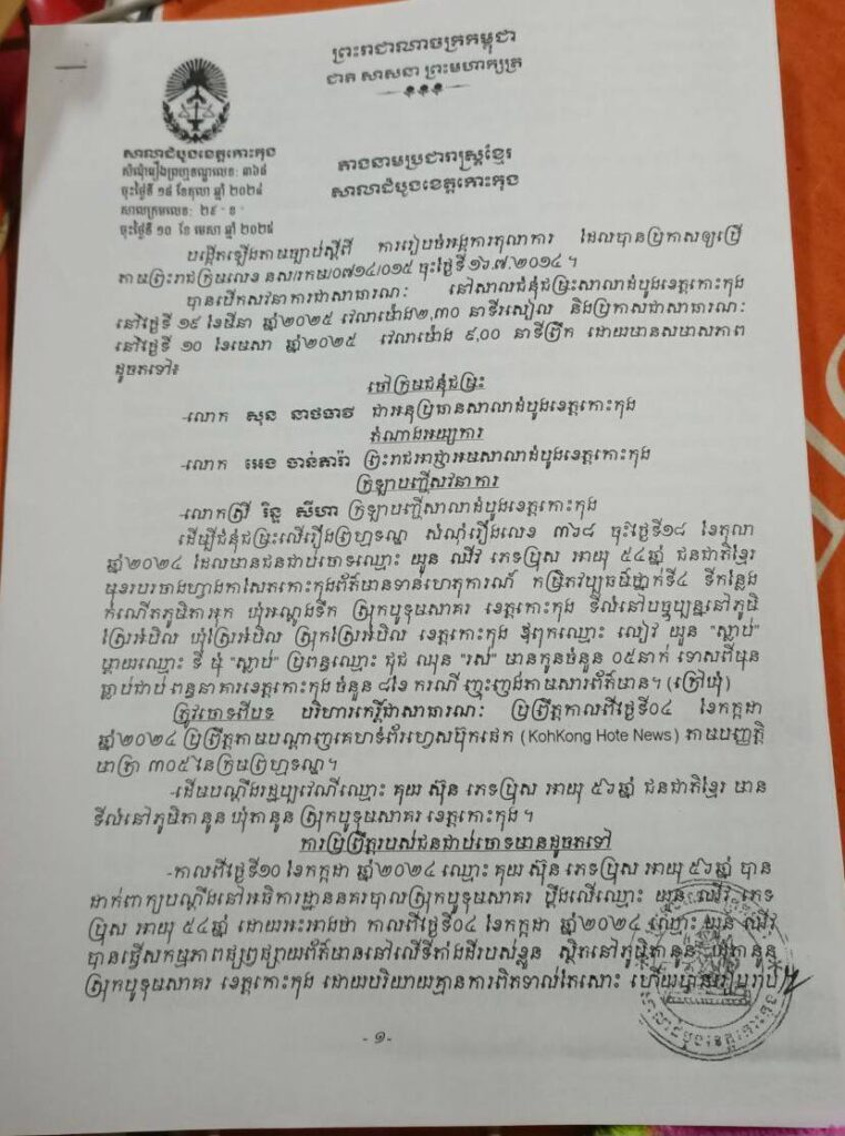 ទី១០ ខែមេសា ឆ្នាំ២០២៥ របស់ សាលាដំបូង ខែត្រកោះកុង។