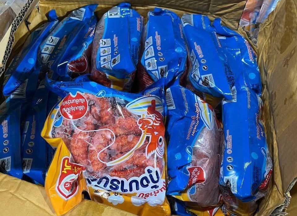 នៅ ថៃ ចំនួន២២៤កេស ស្មើ២,៤៤០គីឡូក្រាម EXP: 2027-07-27។ ទី៣.ប្រហិតបង្កង PFFP ផលិតនៅ ថៃ ចំនួន១១២