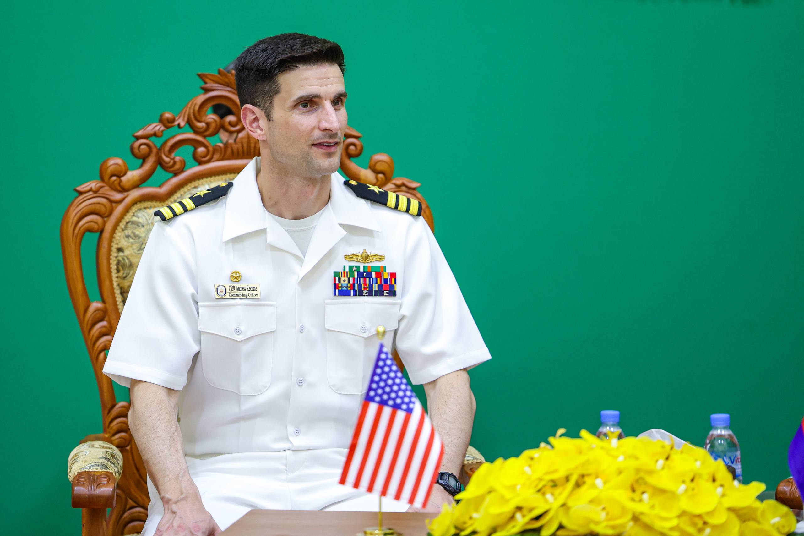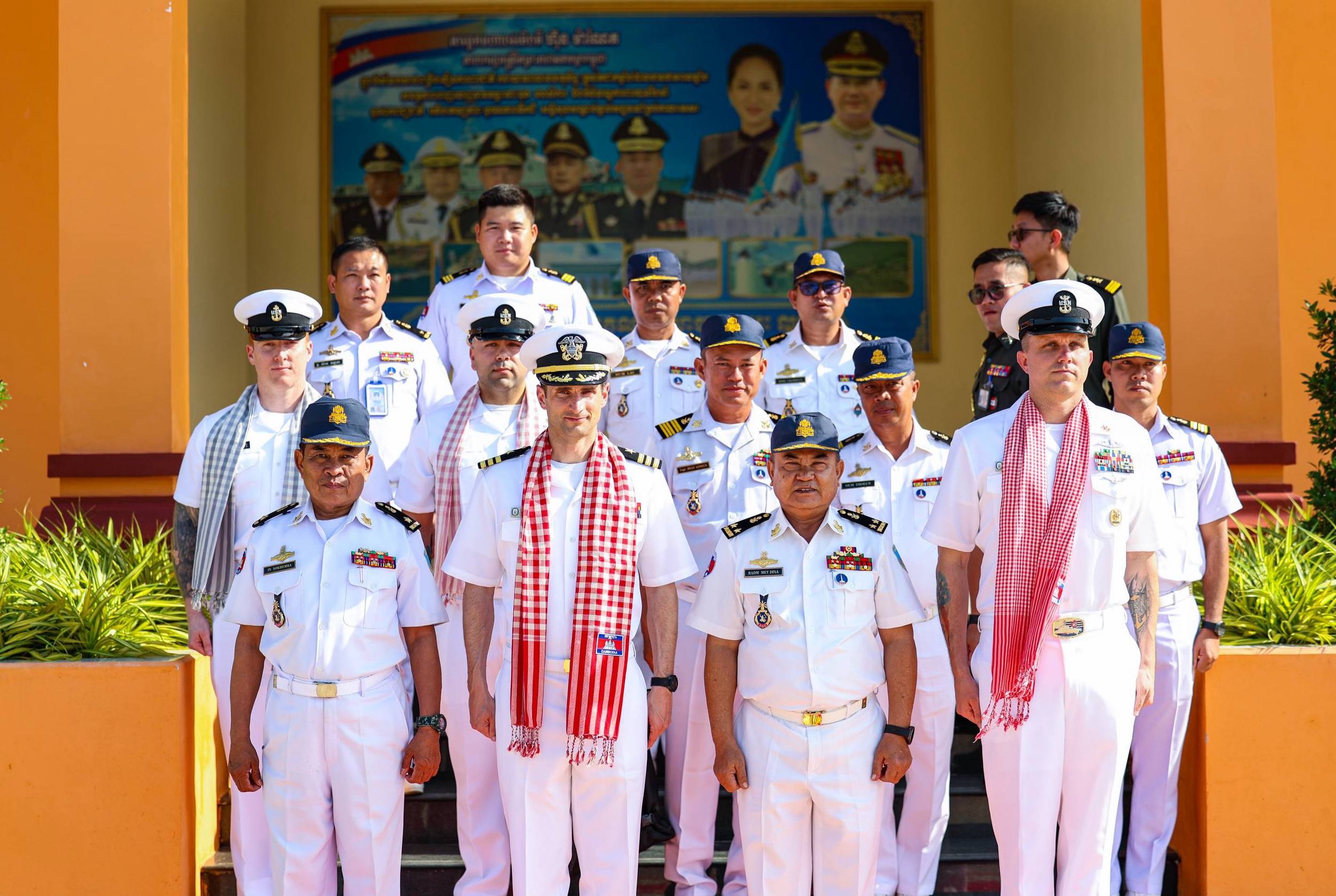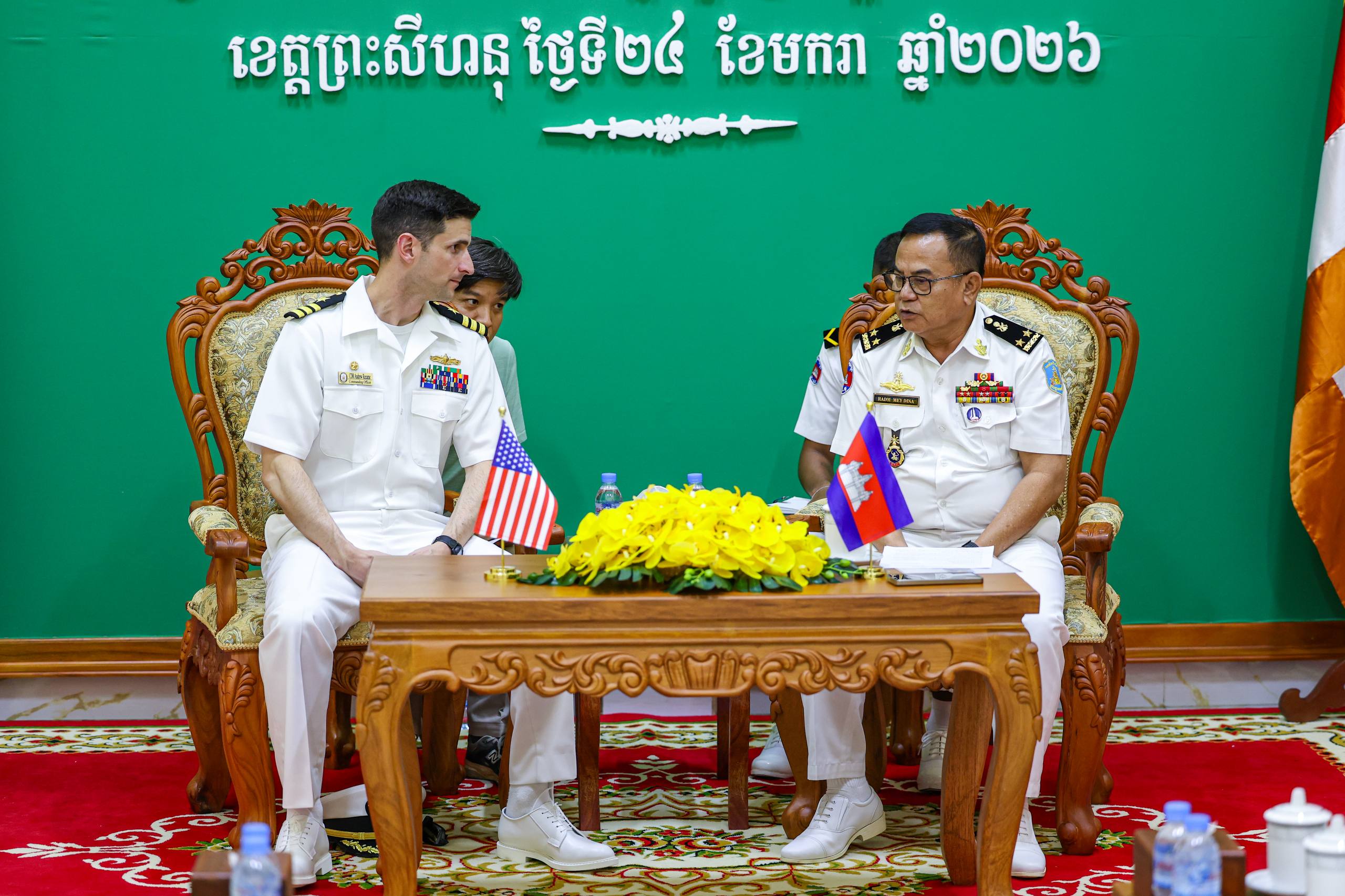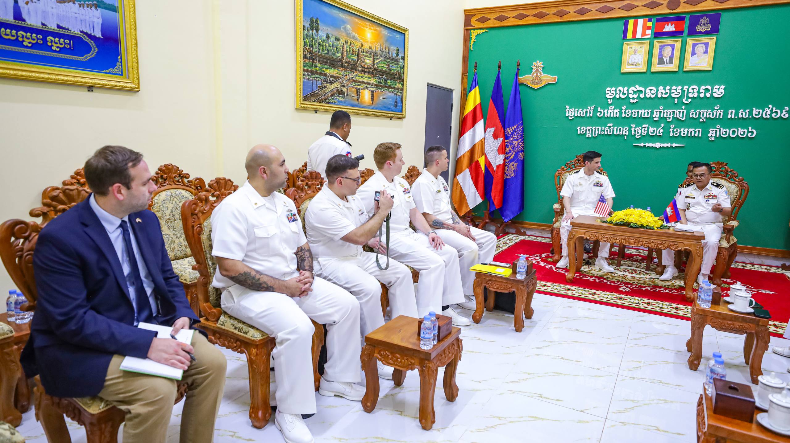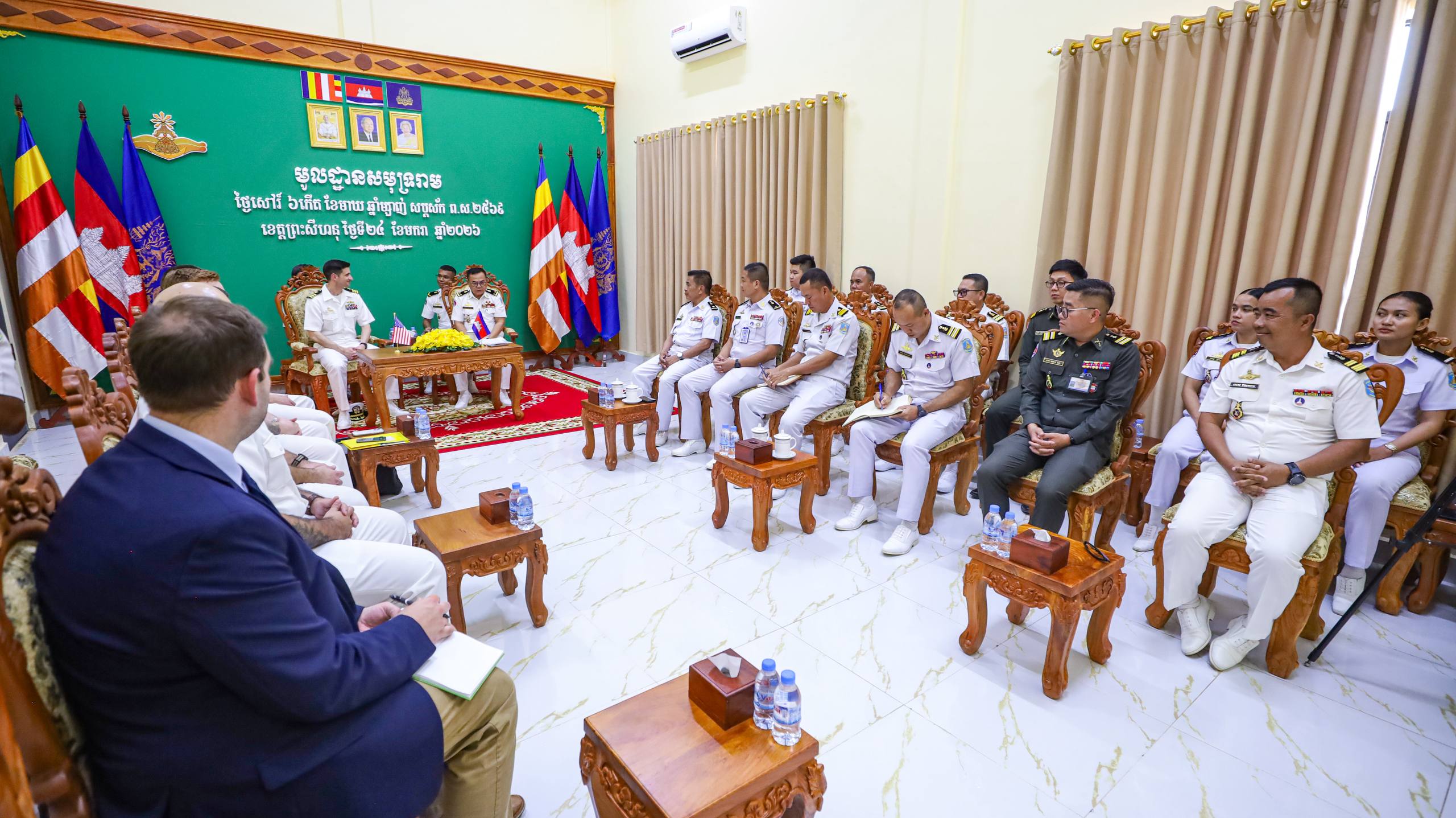 (ព្រះសីហនុ)៖ នារសៀលថ្ងៃសៅរ៍ ទី២៤ ខែមករា ឆ្នាំ២០២៦ គណៈប្រតិភូកងទ័ពជើងទឹកសហរដ្ឋអាម៉េរិក ដឹកនាំដោយលោកវរនាវីទោ Andrew J. Recame មេបញ្ជាការនាវា USS CINCINNATI (LCS 20) និងសហការី អញ្ជើញចូលជួបសម្តែងការគួរសម និងពិភាក្សាការងារជាមួយ ឧត្តមនាវីទោ ម៉ី ឌីណា មេបញ្ជាការមូលដ្ឋានសមុទ្ររាម ដើម្បីពង្រឹងទំនាក់ទំនង សាមគ្គីភាព និងកិច្ចសហប្រតិបត្តិការរវាងកងទ័ពជើងទឹកប្រទេសទាំងពីរ ឱ្យកាន់តែល្អទ្វេឡើងថែមទៀត។